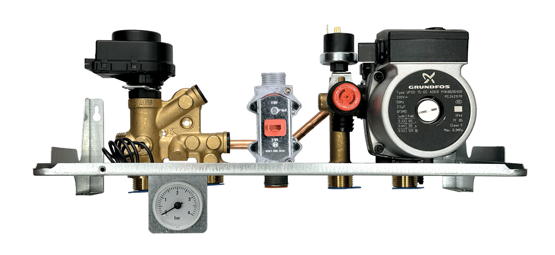 Многоскоростной насос от датского концерна Grundfos. Является критически важным элементом котла, так как работает практически в постоянном режиме и содержит вращающиеся механизмы. Изготовлен из самых надежных и дорогостоящих материалов: керамический вал, керамические подшипники, ротор в оболочке из нержавеющей стали, гильза ротора из нержавеющей стали, рабочее колесо из термостойкого композита, медная обмотка статора и др.